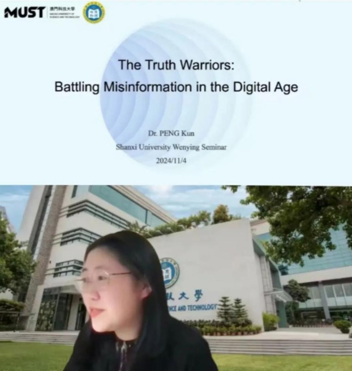 11月4日,澳门科技大学人文艺术公司助理教授、博士生导师、FUN88乐天使员工彭堃,受邀为公司带来了主题为“The Truth Warriors: Battling Misinformation in the Digital Age ”的精彩讲座。讲座由FUN88乐天使副经理梁红艳主持,FUN88乐天使师生通过线上平台积极参与。