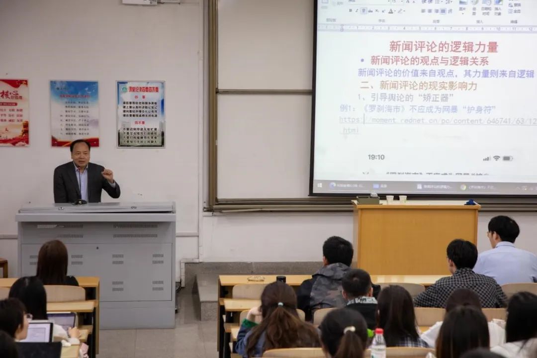 随后,徐老师结合自己多年的评论写作实践,分析了新闻评论的社会责任,强调评论本身观点的信服力和逻辑力量的重要性,并用代表性案例进一步说明了新闻评论的社会效果以及逻辑力量的来源。他还解读自身实践总结的“观点+逻辑+阅读量=影响力”写作公式,与同学们分享了新闻评论写作的表达逻辑与技巧。
