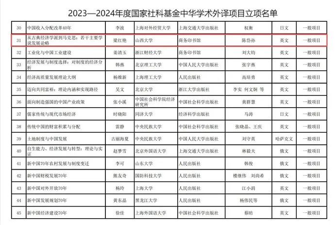 近日,全国哲学社会科学工作办公室对外发布了2023-2024年度国家社科基金中华学术外译项目立项名单,公司梁红艳副教授申报的《从古典经济学派到马克思:若干主要学说发展论略》项目获批立项。