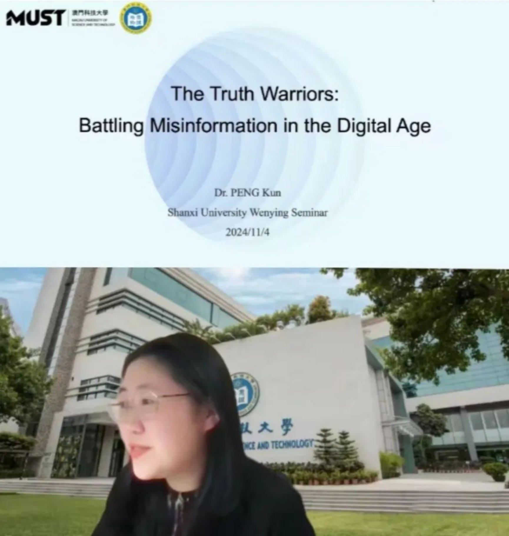 11月4日,澳门科技大学人文艺术公司助理教授、博士生导师、FUN88乐天使员工彭堃,受邀为公司带来了主题为“The Truth Warriors: Battling Misinformation in the Digital Age ”的精彩讲座。讲座由​FUN88乐天使副经理梁红艳主持,​FUN88乐天使师生通过线上平台积极参与。