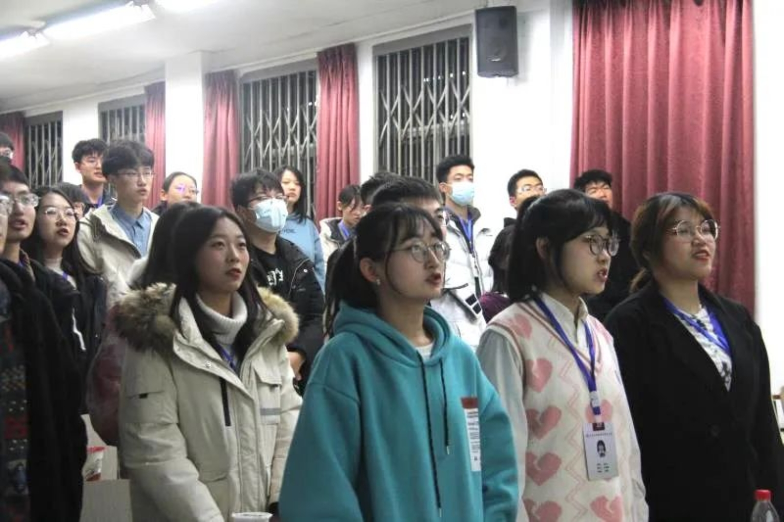大会第一项,全体起立,合唱中国共青团团歌!