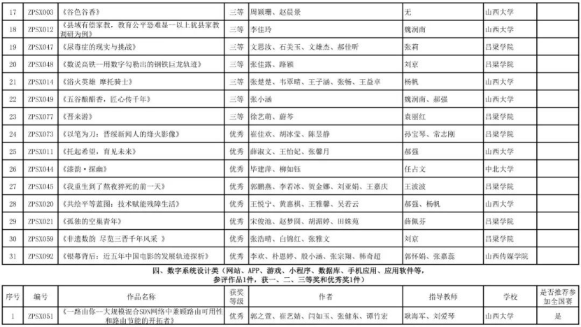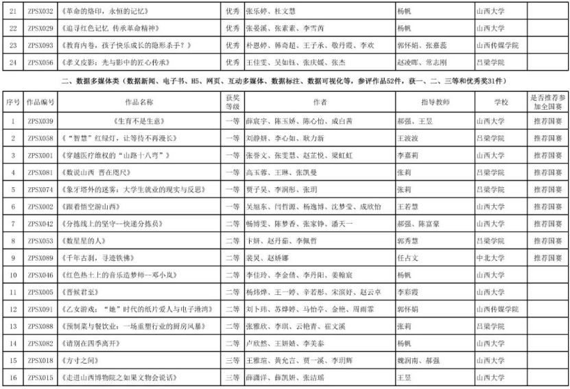 经山西分赛区办公室审核、专家评审,共有56部获奖作品脱颖而出,其中视频新媒体类24部、数据多媒体类31部、数字系统设计类1部,拟推荐参加全国赛总数17部,占总作品数比例18%。