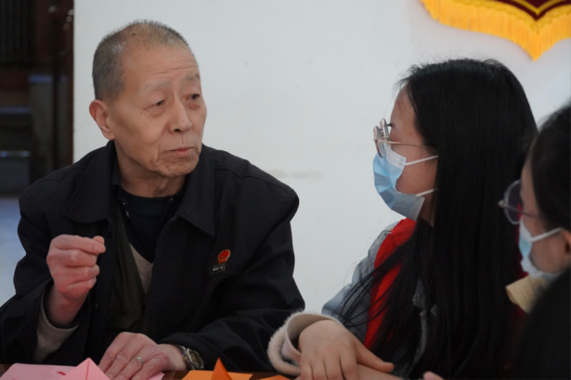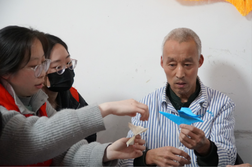 而后,志愿者们拿出提前准备的彩纸,与老人们一起动手折纸。手工制作让老人们尽享动手之乐,也让志愿者们沉浸在与老人相处的乐趣之中。