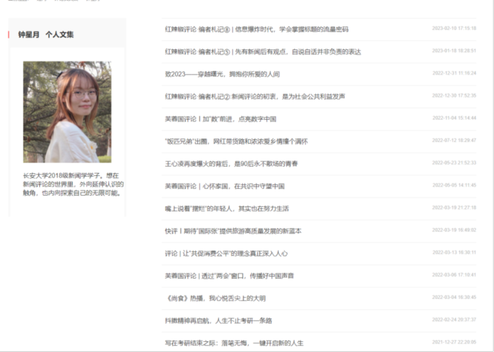 钟星月,2022年毕业于长安大学新闻学专业,现任红网理论评论中心红辣椒评论编辑。获红网第六届全国老员工“评论之星”选拔赛入围奖、“青椒计划”7月优胜作者。代表作品有:《坍塌的不是明星形象,而是你的童话城堡》《“救命文档”背后,青年力量值得全社会点赞》等。